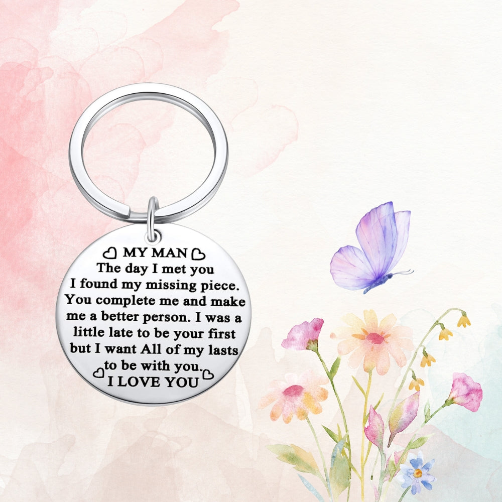 • This beautifully crafted keyring features the touching message: "My Man, The Day I Met You I Found My Missing Piece. You Complete Me And Make Me A Better Person. I Was A Little Late To Be Your First But I Want All Of My Lasts To Be With You. I Love You."