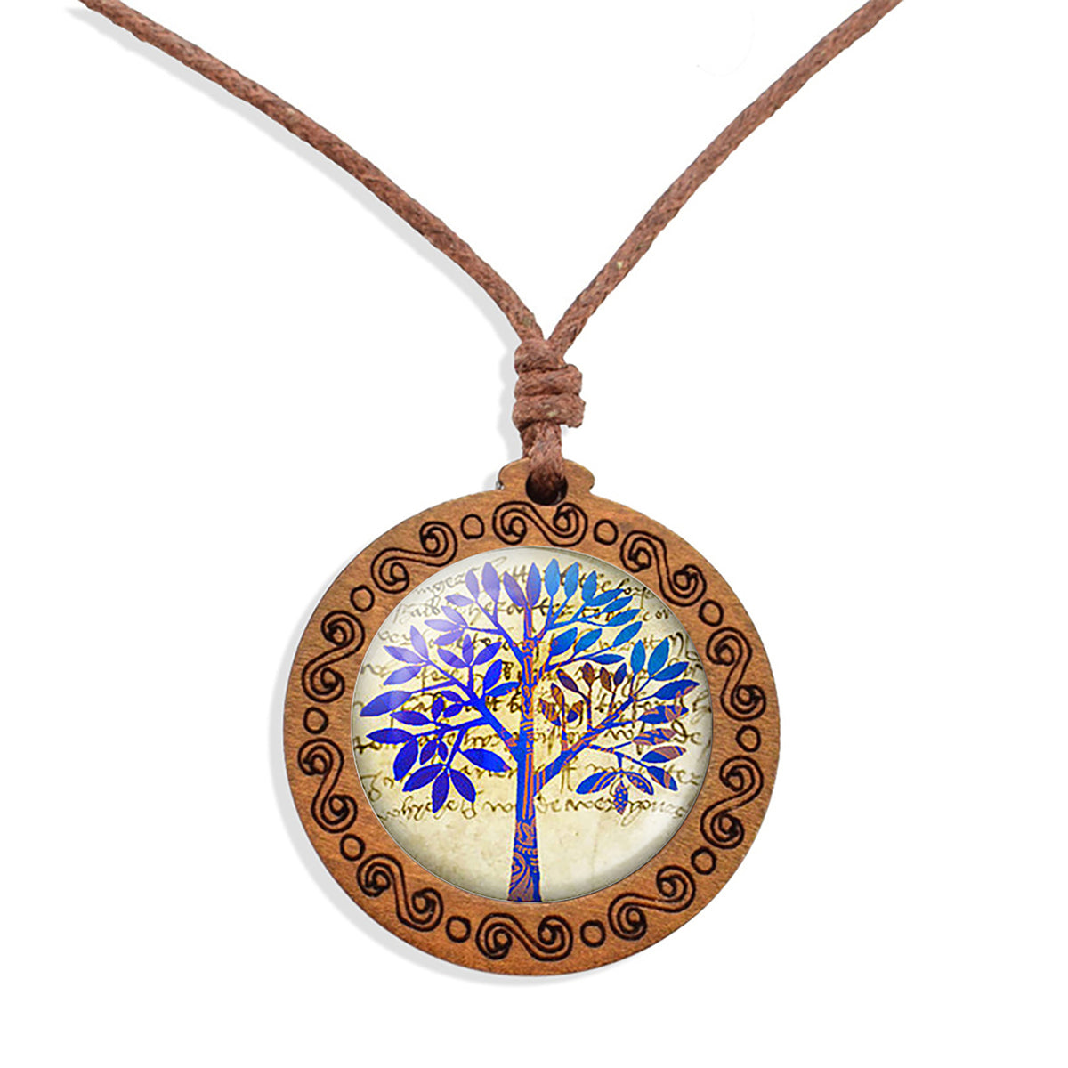 Azure Tree Of Life Ethnic Spiritual Wooden Pendant Encased Glass Dome Bohemian Unisex Necklace Adjustable 45-86cm