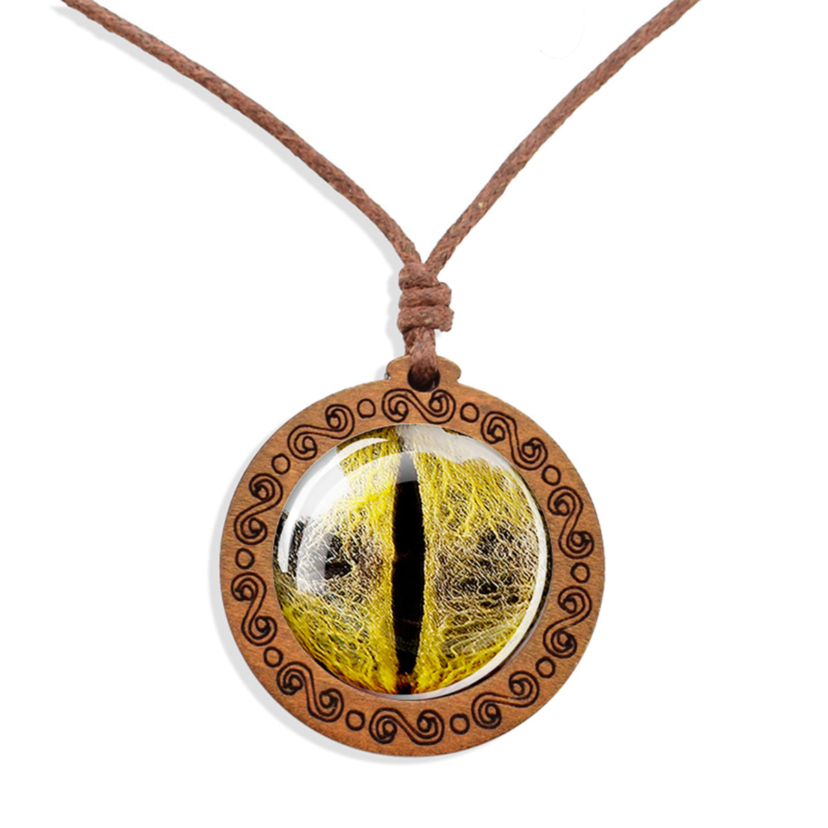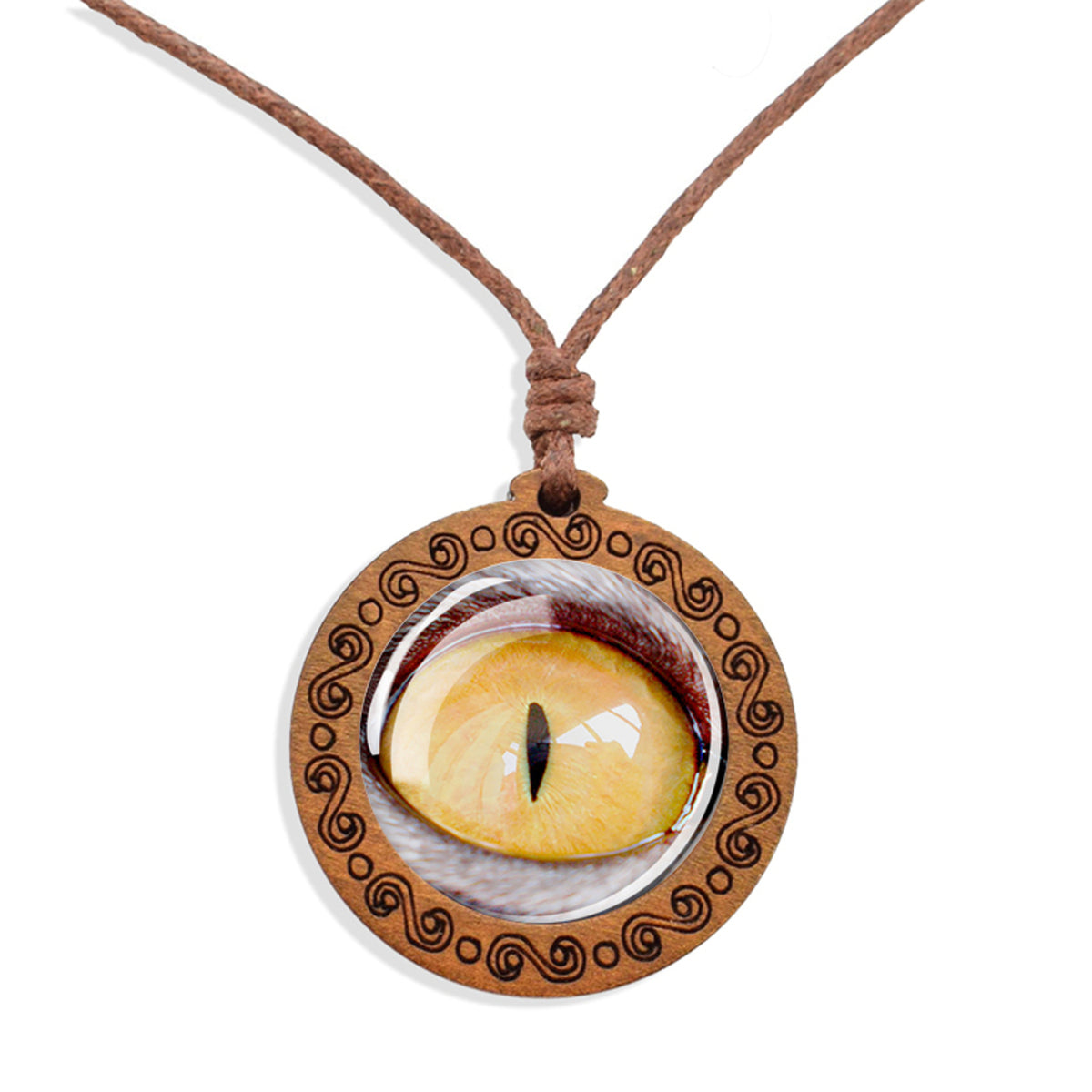 Boho Cat Eye Animal Wooden Pendant Encased Glass Dome Bohemian Unisex Necklace Adjustable 45-86cm