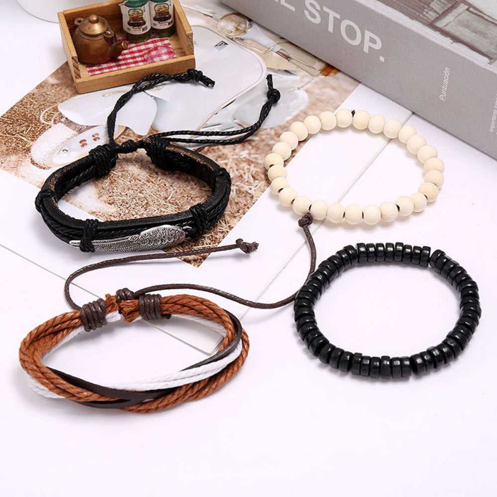 Ethnic Boho 4-Piece Multi-Colour Set PU Leather Adjustable Bracelets with Wing Charm Gothic Steampunk Bohemian Unisex Wristband