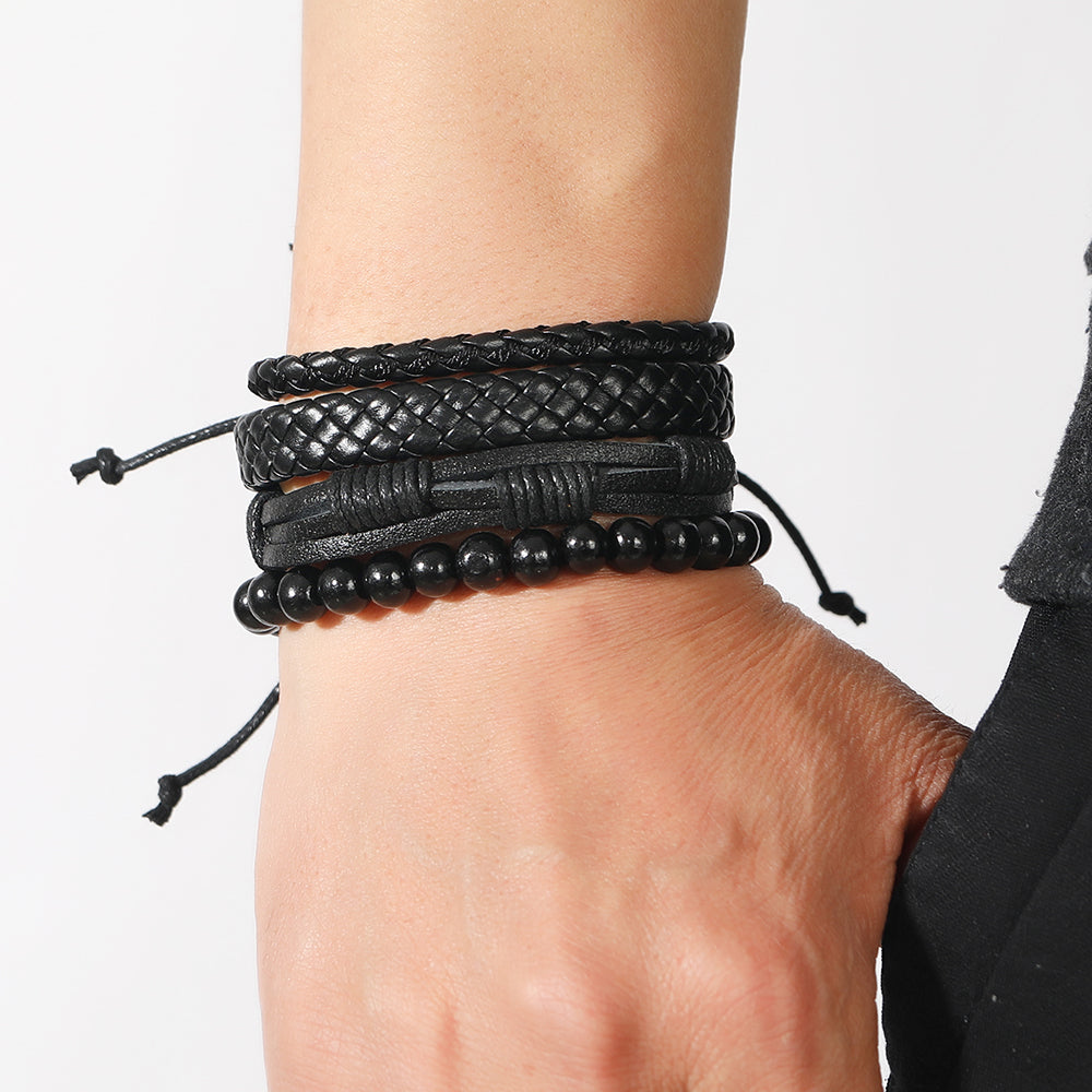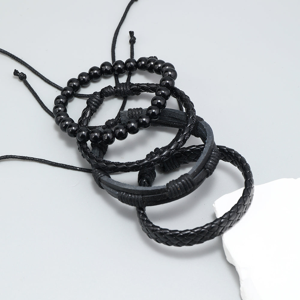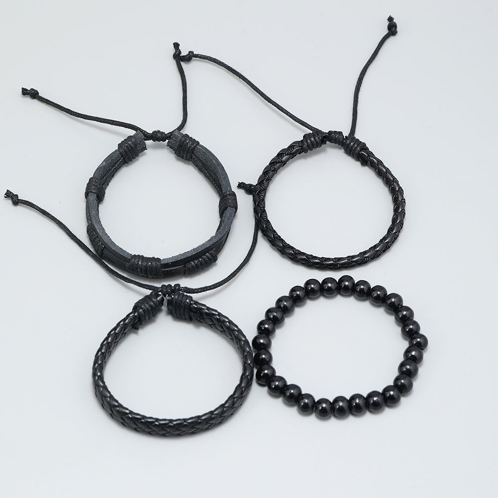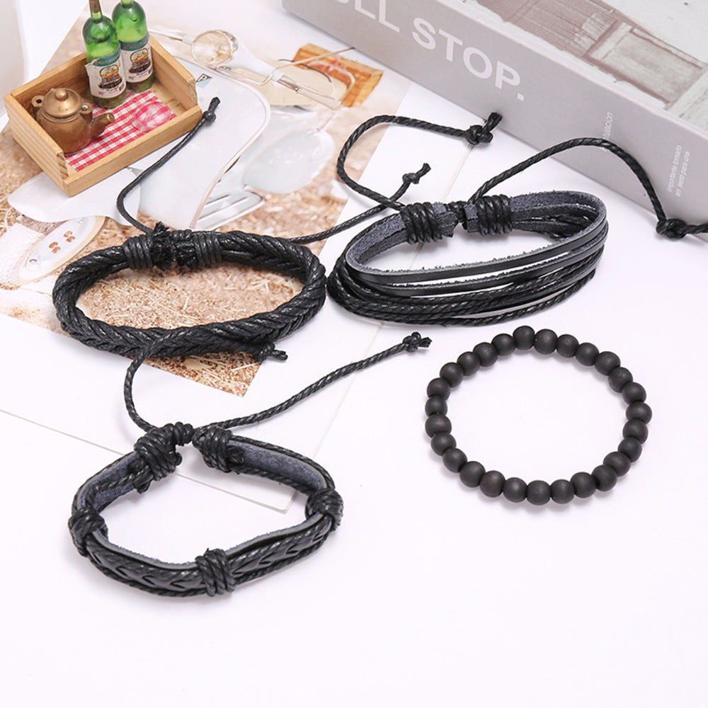 PU Leather Ethnic Boho 4-Piece Beaded Woven Simple Set Adjustable Bracelets Gothic Steampunk Bohemian Unisex Wristband in Black