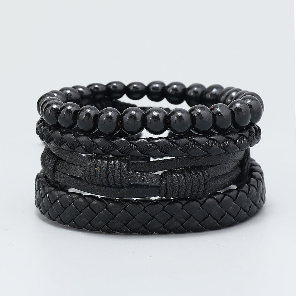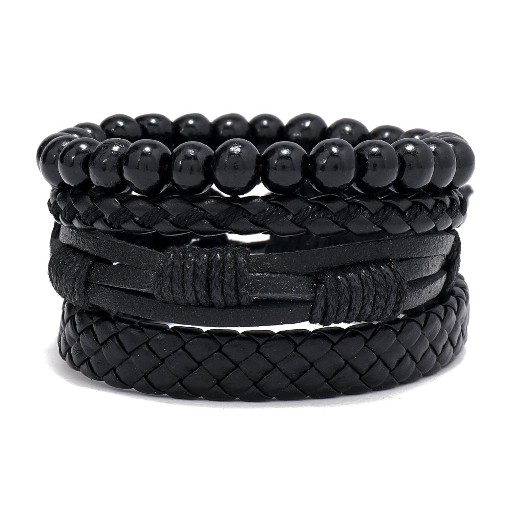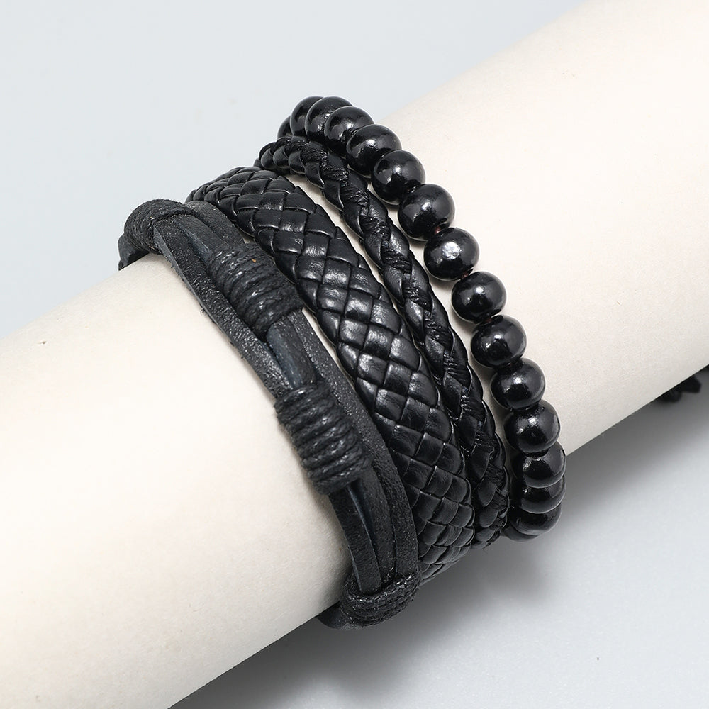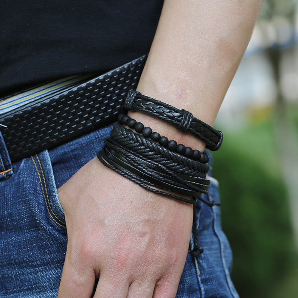 PU Leather Ethnic Boho 4-Piece Beaded Woven Simple Set Adjustable Bracelets Gothic Steampunk Bohemian Unisex Wristband in Black