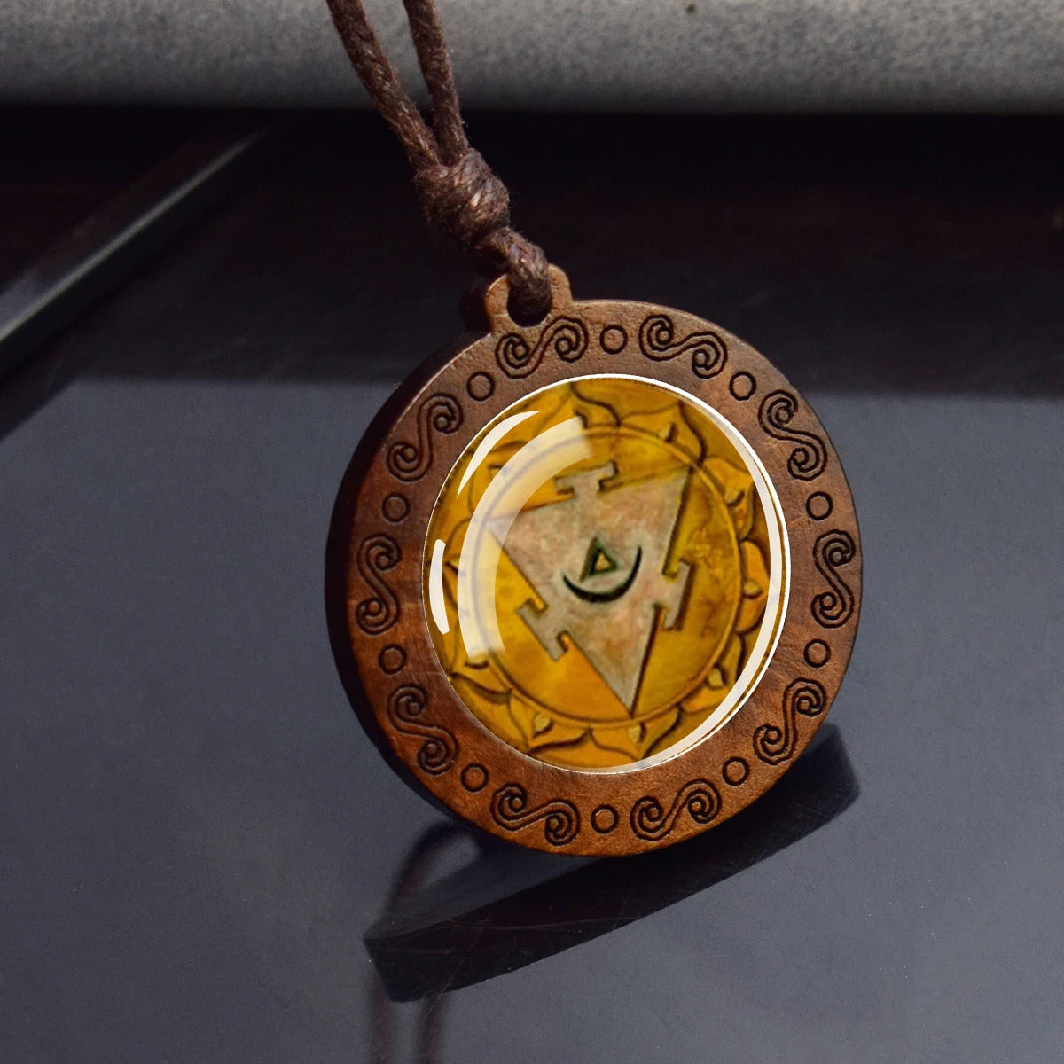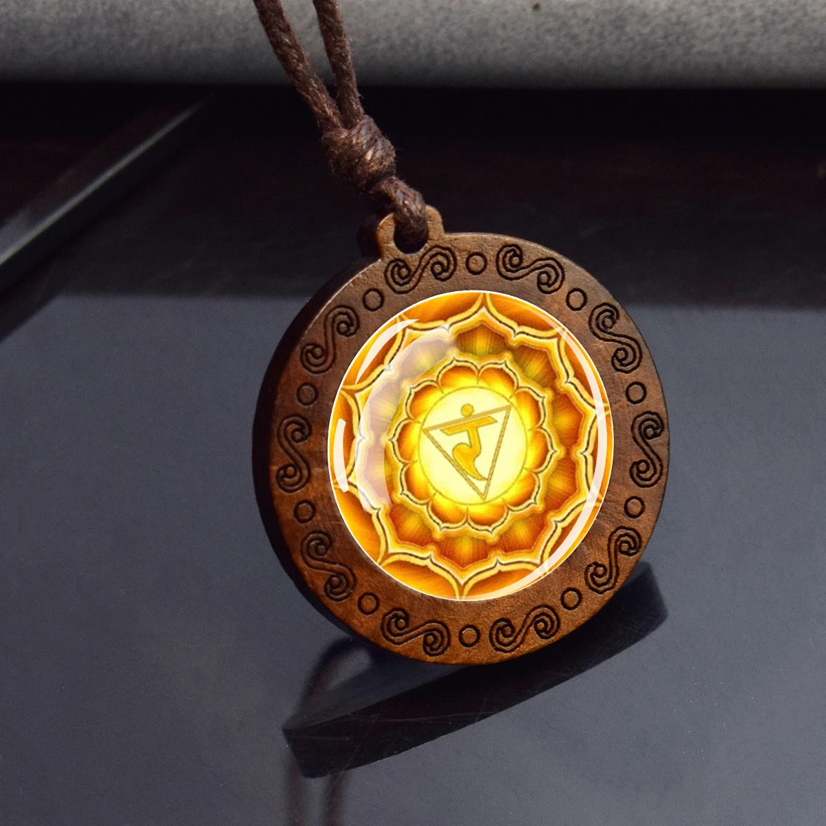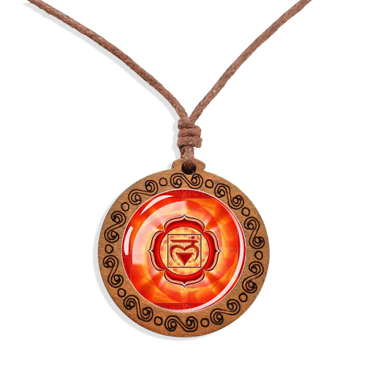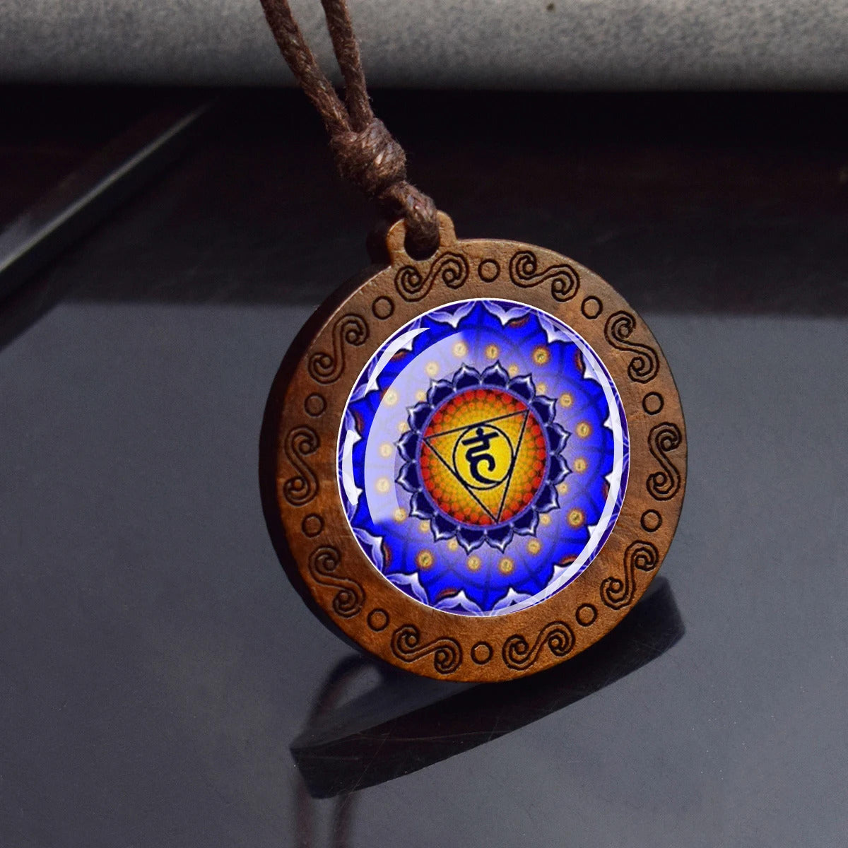 Boho Chakra Mandala Buddha Ethnic Spiritual Wooden Pendant Encased Glass Dome Bohemian Unisex Necklace Adjustable 45-86cm