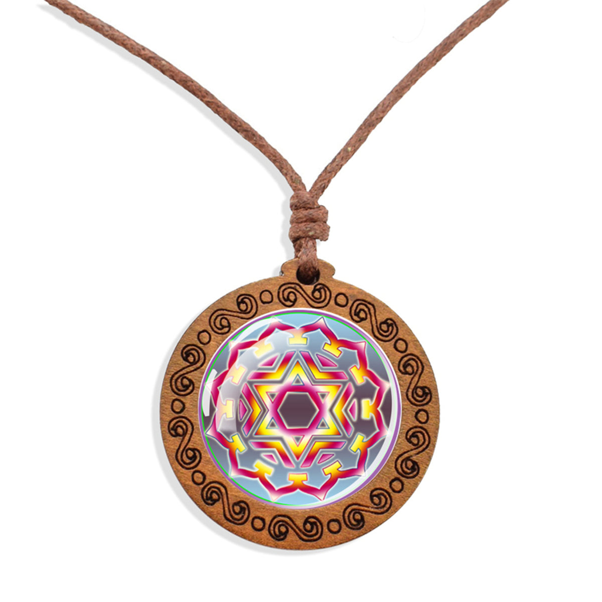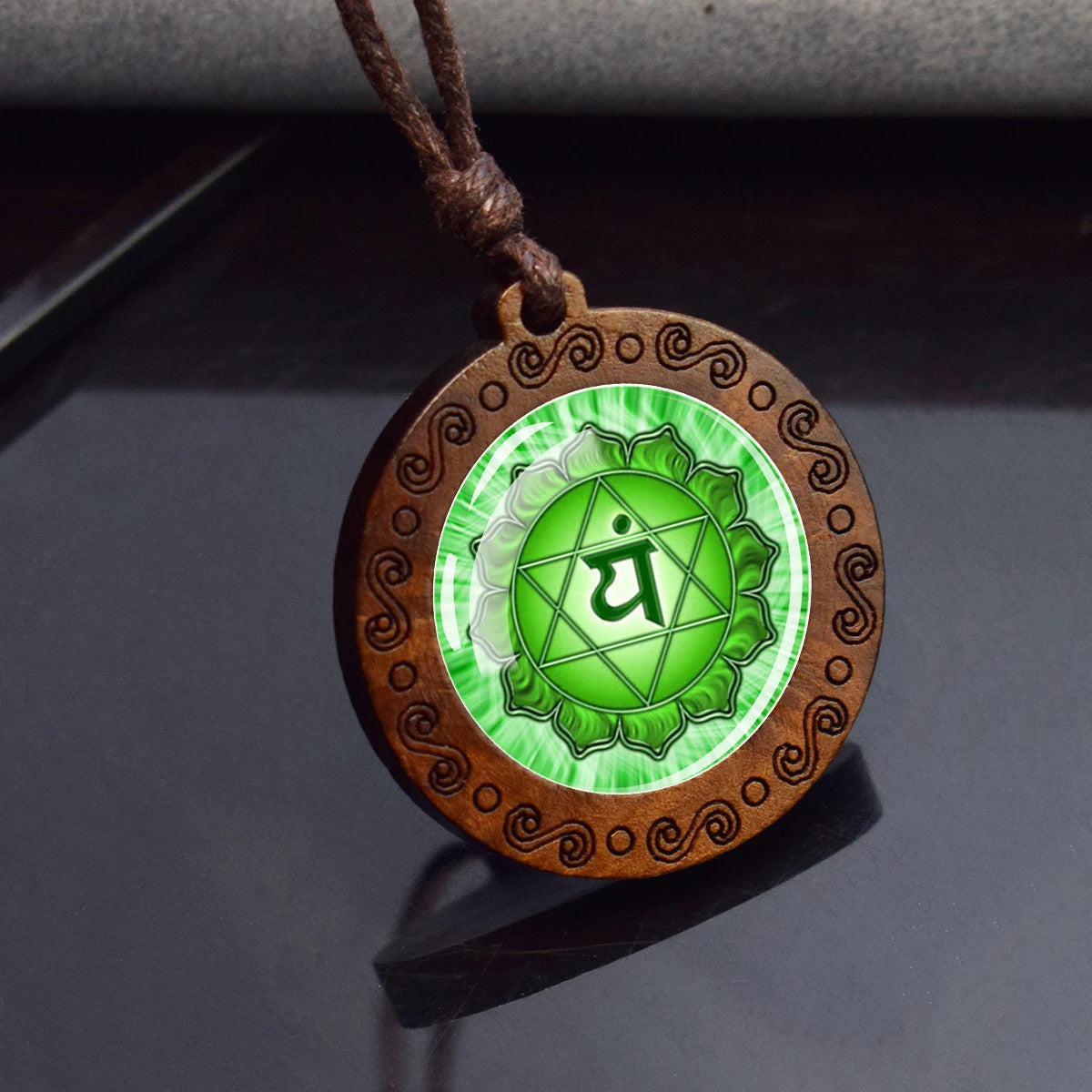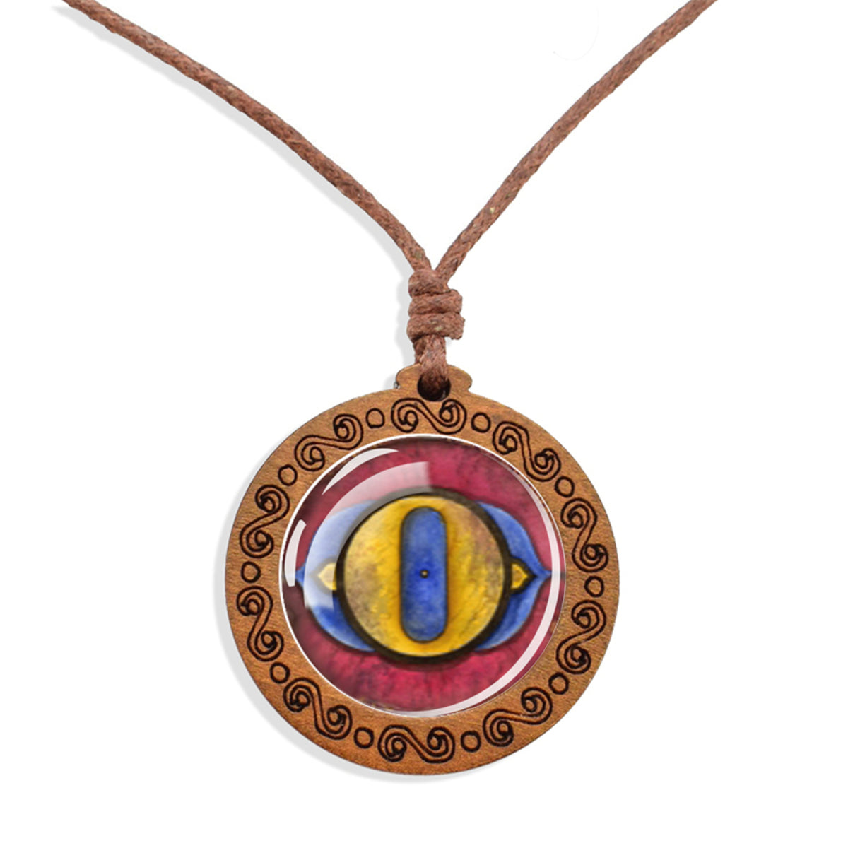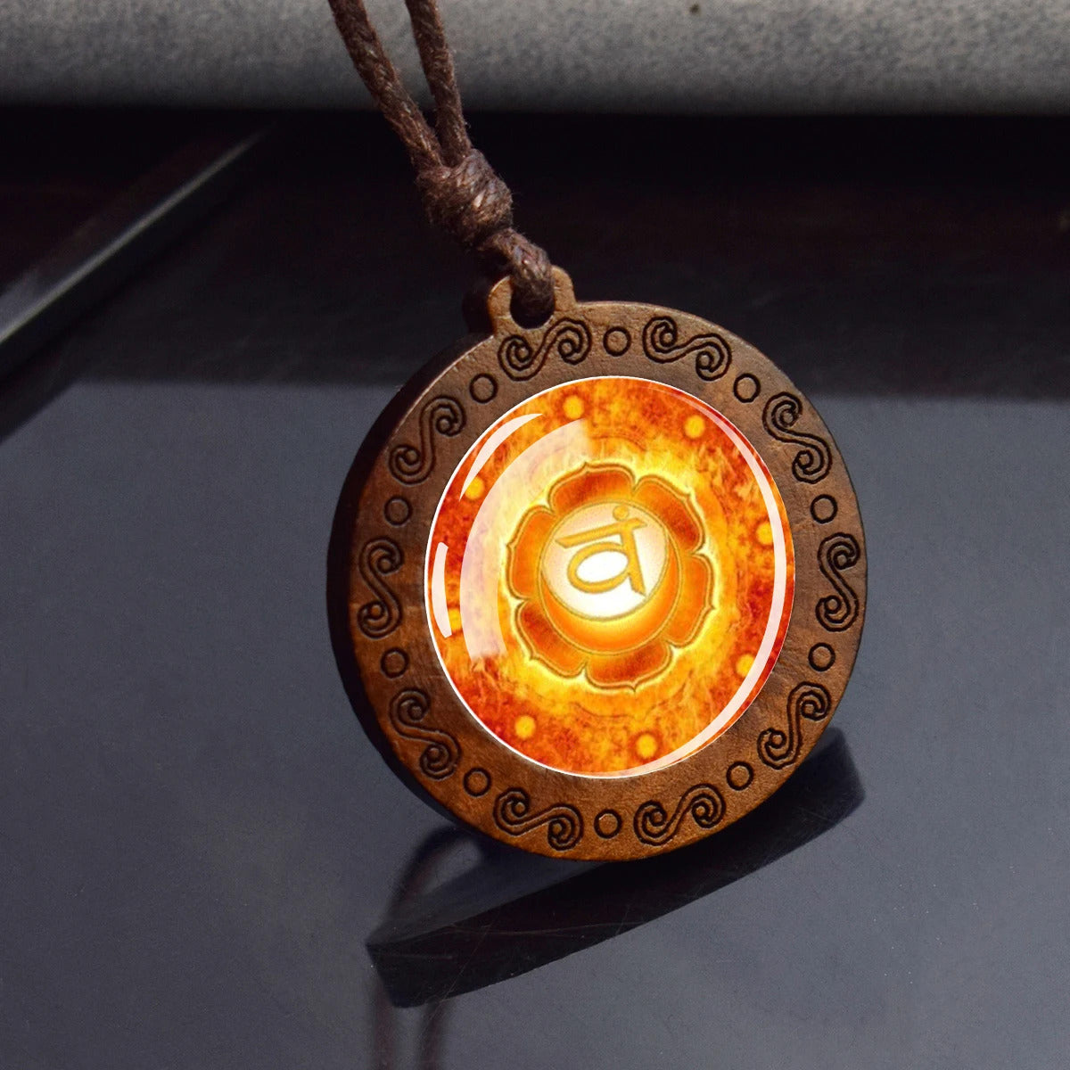 Boho Chakra Mandala Buddha Ethnic Spiritual Wooden Pendant Encased Glass Dome Bohemian Unisex Necklace Adjustable 45-86cm