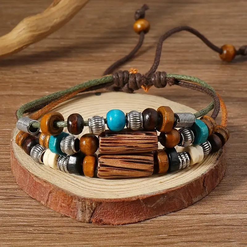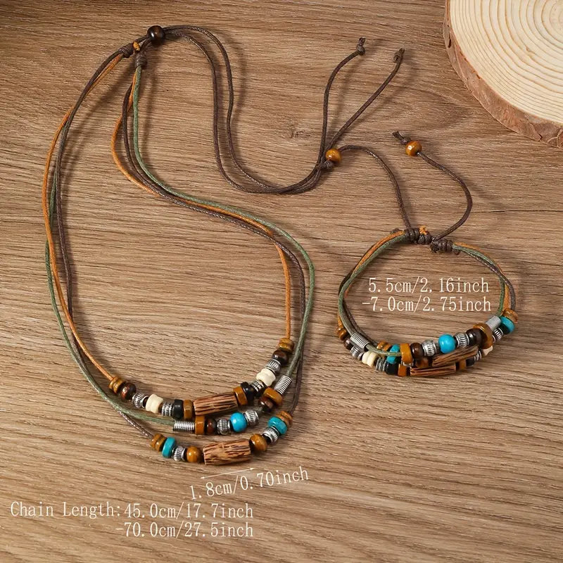 PU Leather Natural Boho Necklace & Bracelet Set, Wooden & Metal Beads, Ethnic, Long Chain