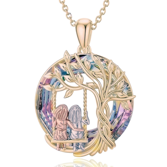 Tree Of Life Sisters Friends Mother & Daughter On A Swing Purple Blue Crystal Round Pendant Charm Necklace Gift For Sister Friend Mother Daughter For Birthday Special Occasion