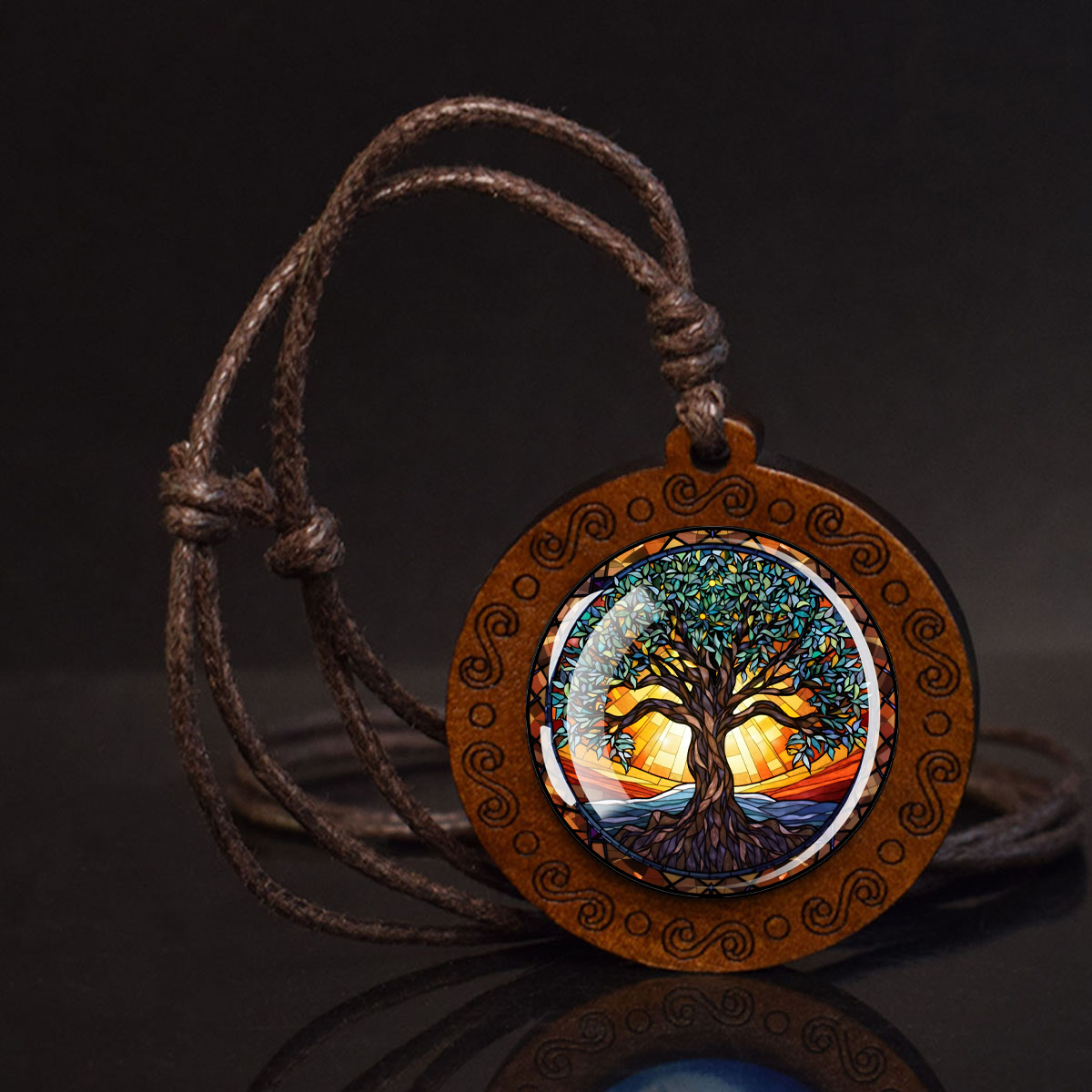 Boho Blue Blossom Tree Of Life Ethnic Spiritual Wooden Pendant Encased Glass Dome Bohemian Unisex Necklace Adjustable 45-86cm