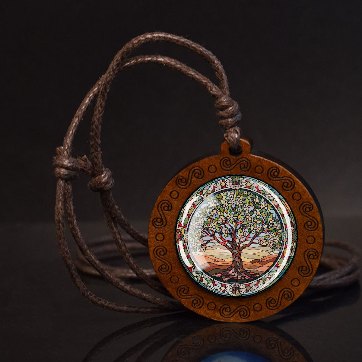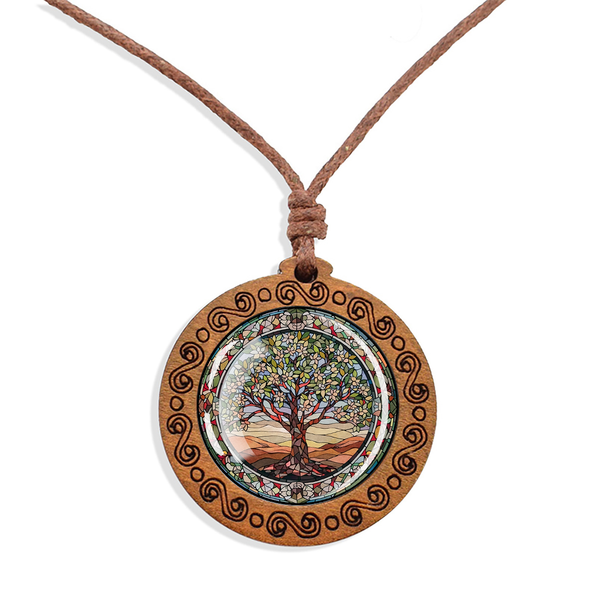 Boho Mountain Tree Of Life Ethnic Spiritual Wooden Pendant Encased Glass Dome Bohemian Unisex Necklace Adjustable 45-86cm