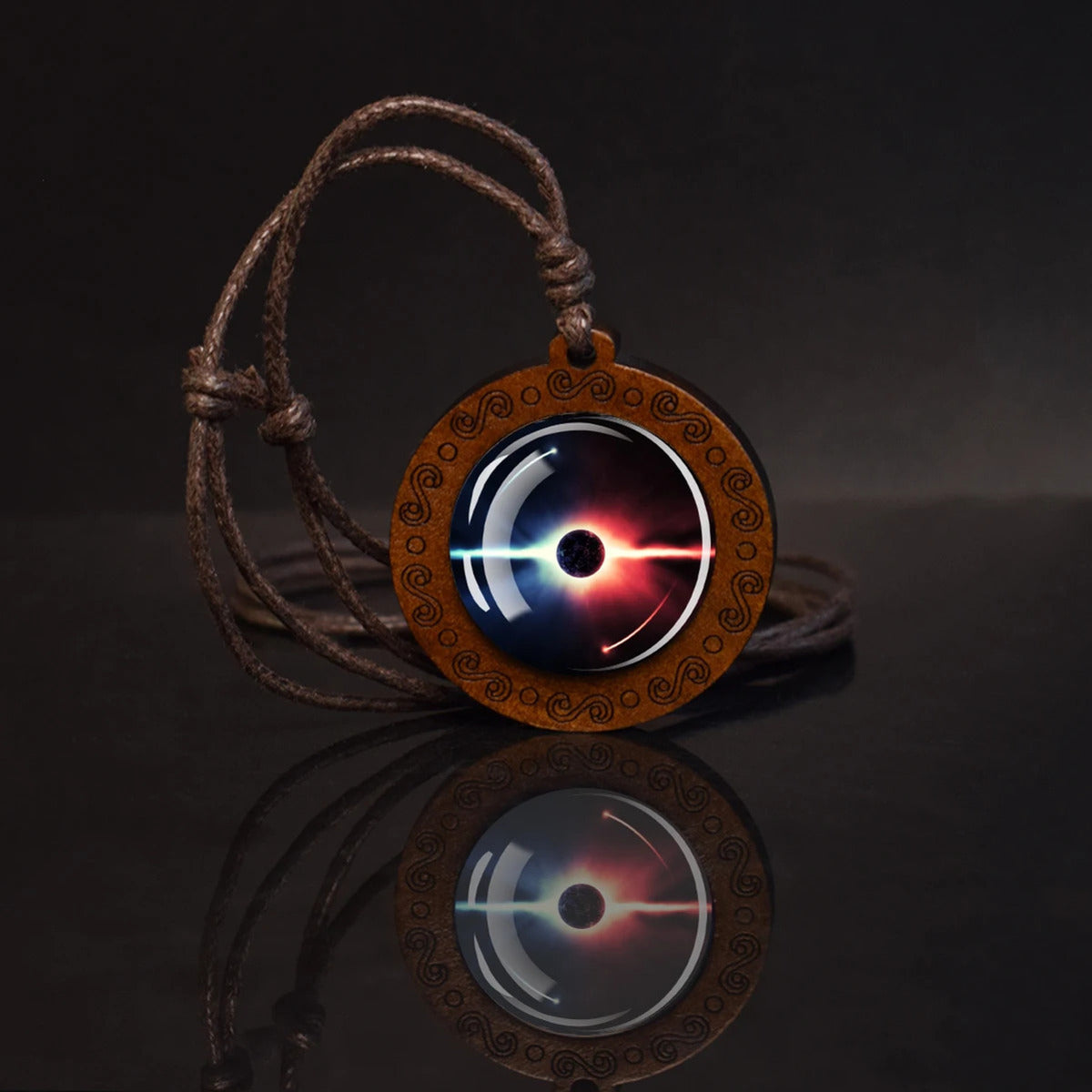 Boho Yin Yang Cosmic Ethnic Spiritual Wooden Pendant Encased Glass Dome Bohemian Unisex Necklace Adjustable 45-86cm