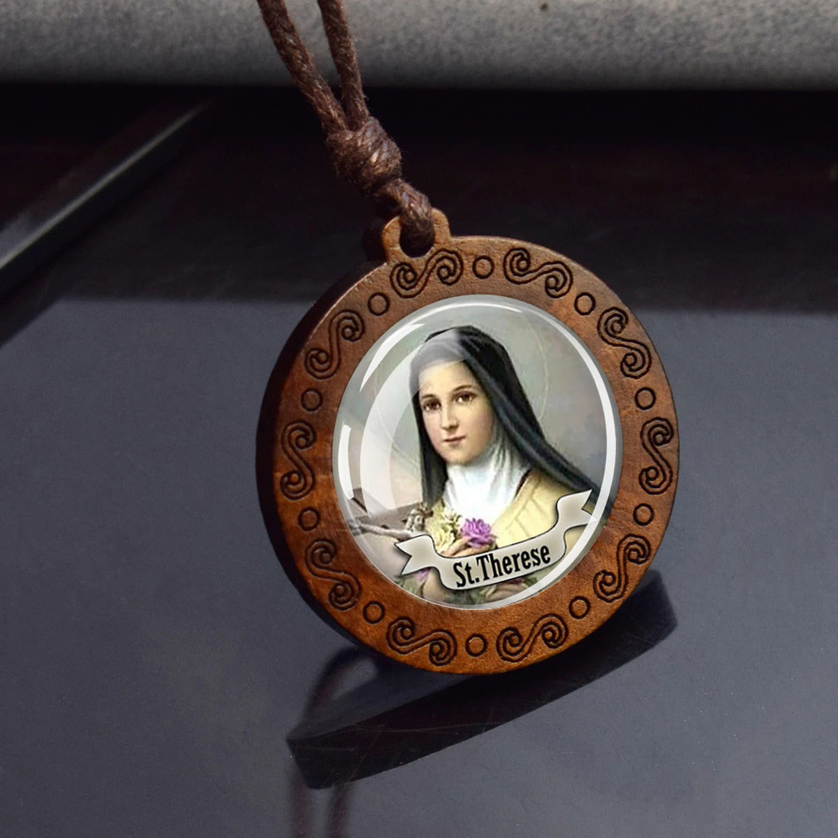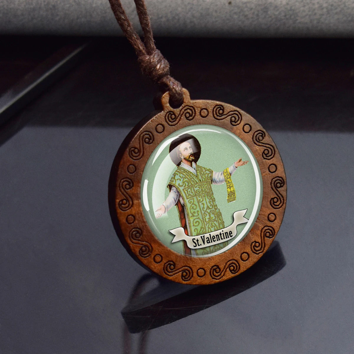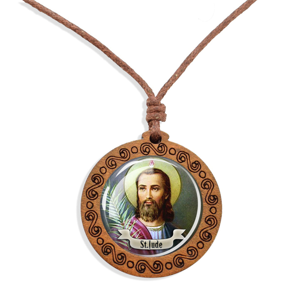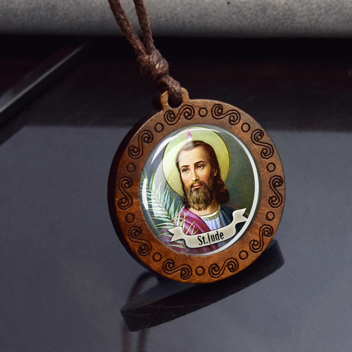 • This unique necklace features a natural wooden frame encasing a vibrant dome image of one of twelve saints, each styled with retro flair and symbolic detail. Representing faith, courage, protection, and wisdom, each saint brings their own energy and message to this wearable expression of spirituality.