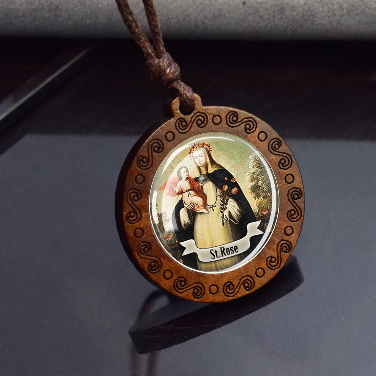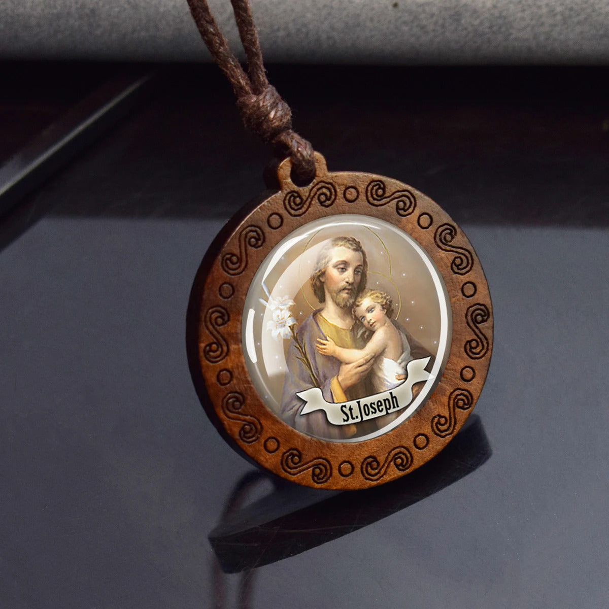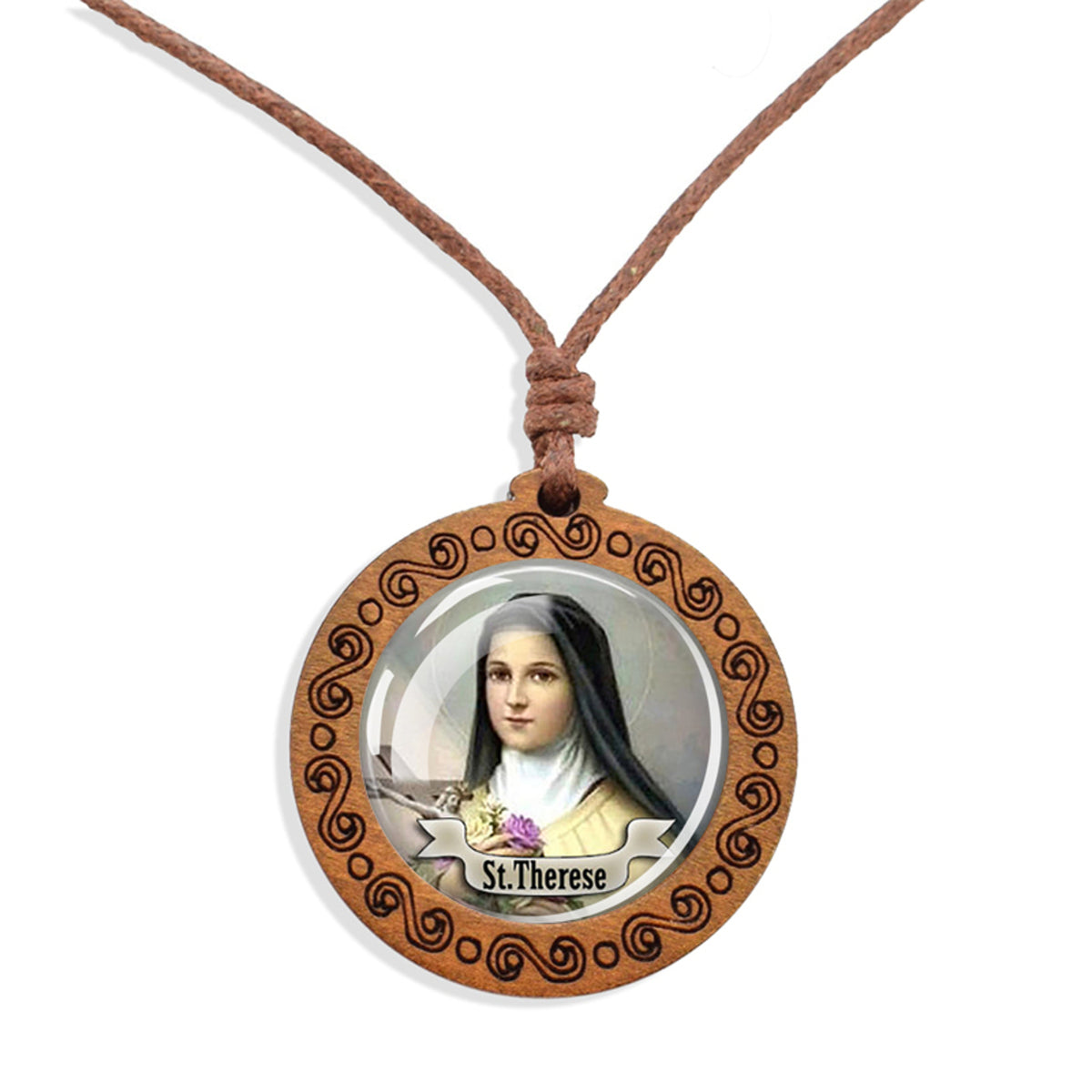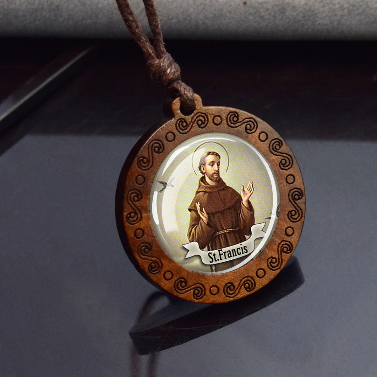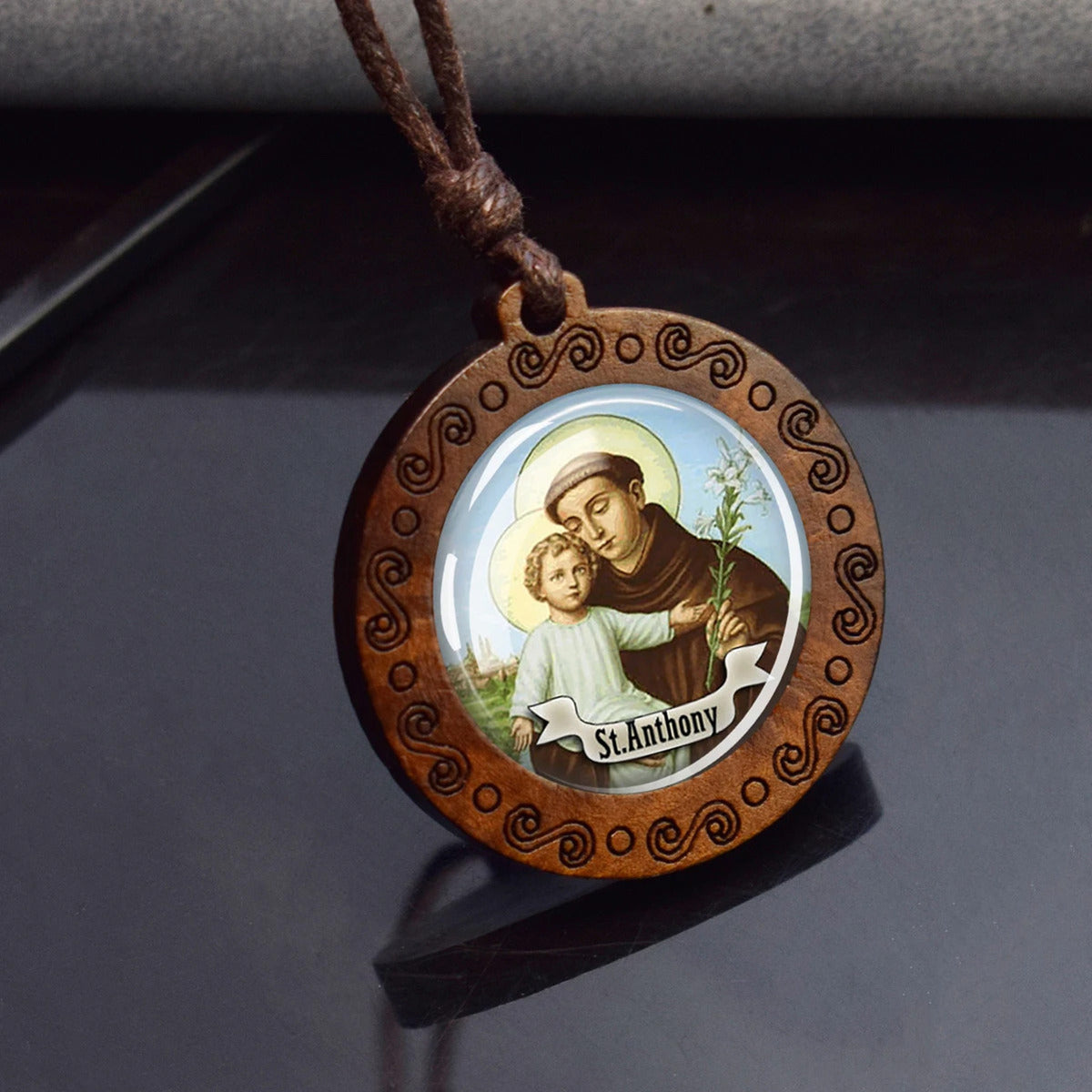 • This unique necklace features a natural wooden frame encasing a vibrant dome image of one of twelve saints, each styled with retro flair and symbolic detail. Representing faith, courage, protection, and wisdom, each saint brings their own energy and message to this wearable expression of spirituality.