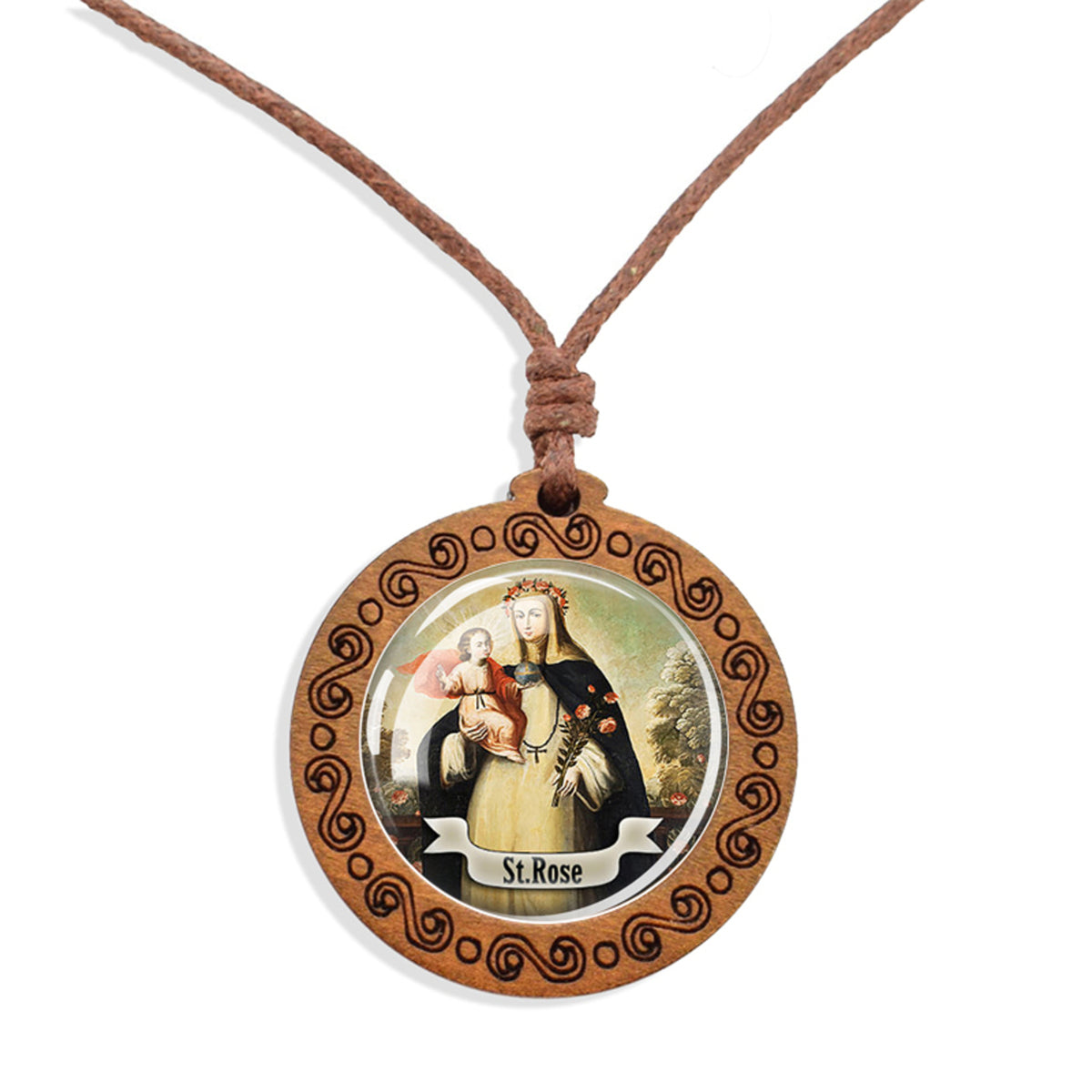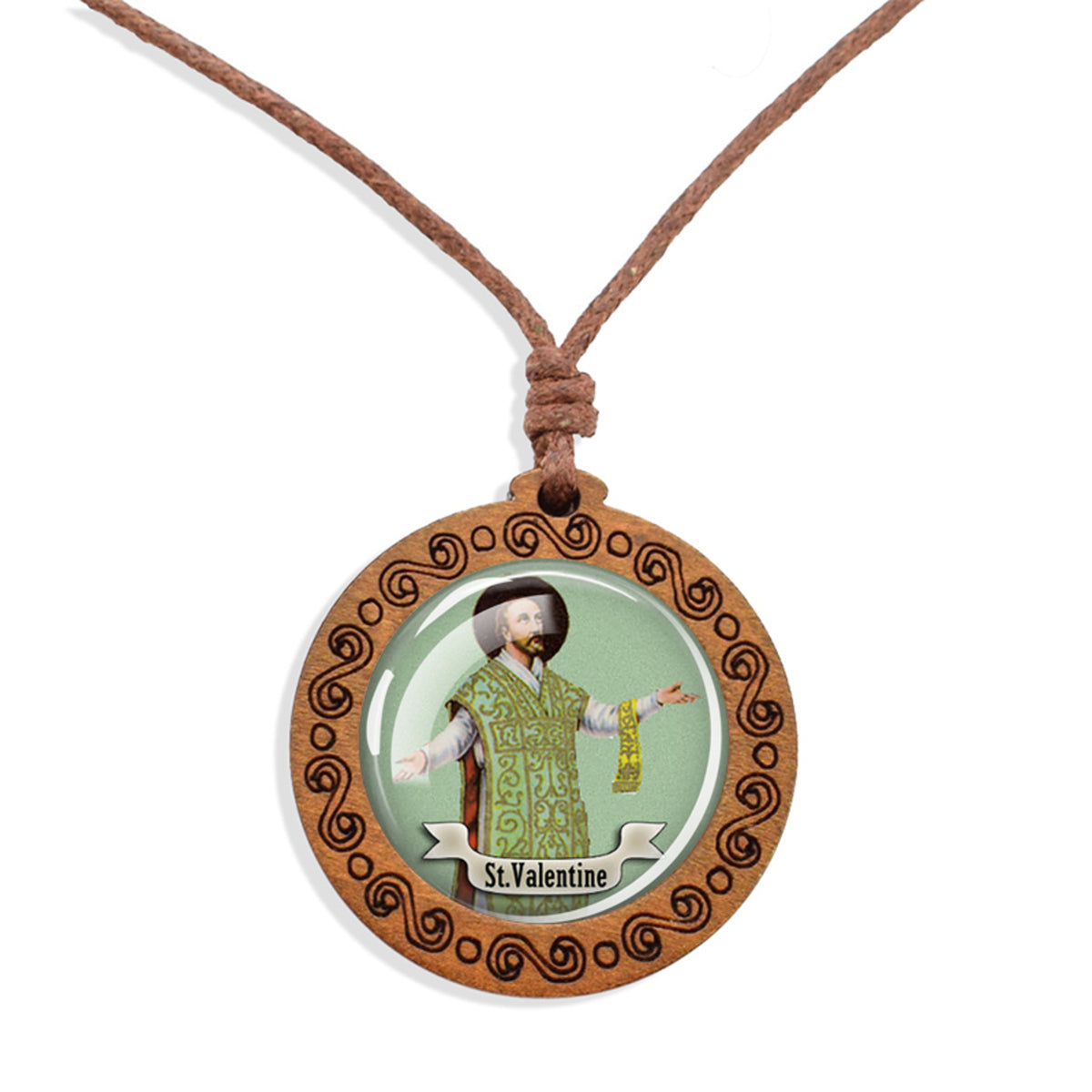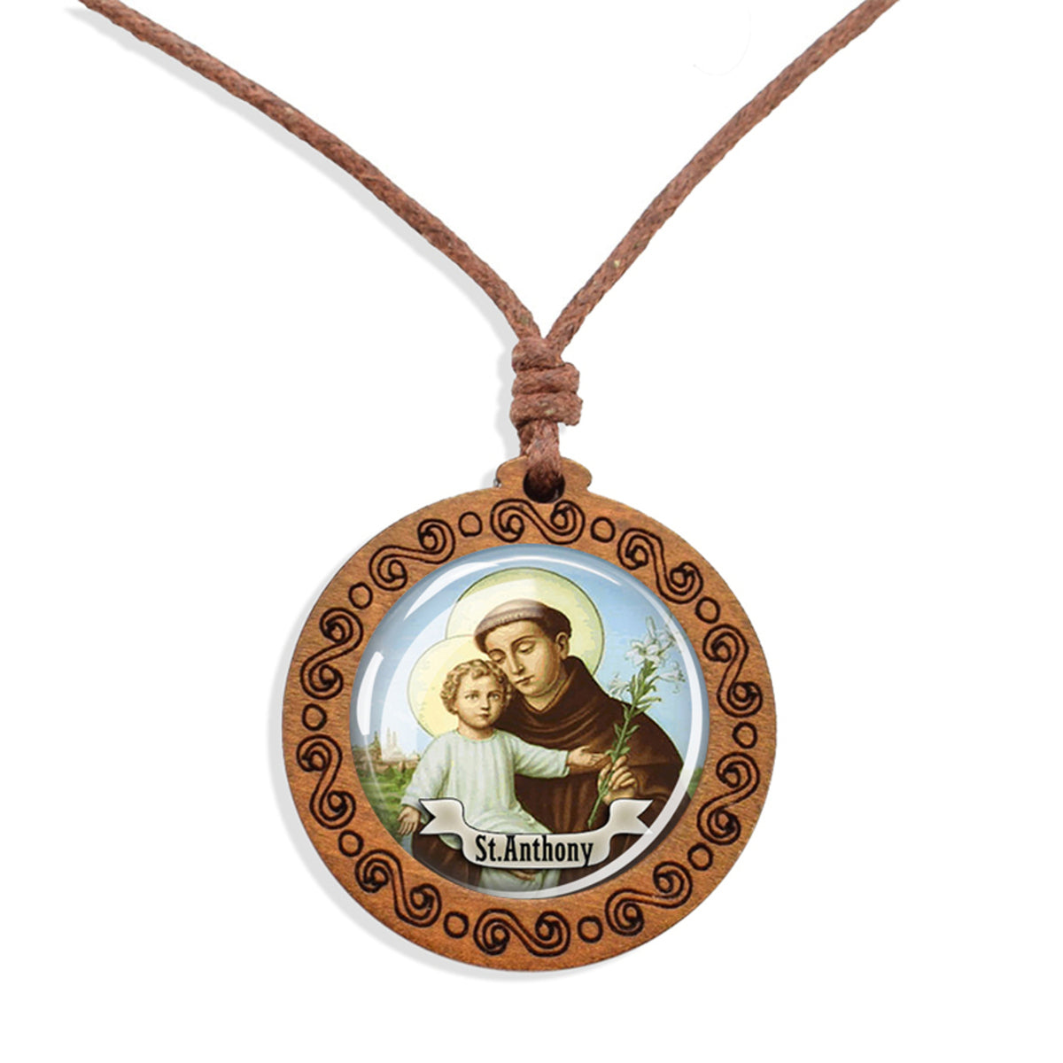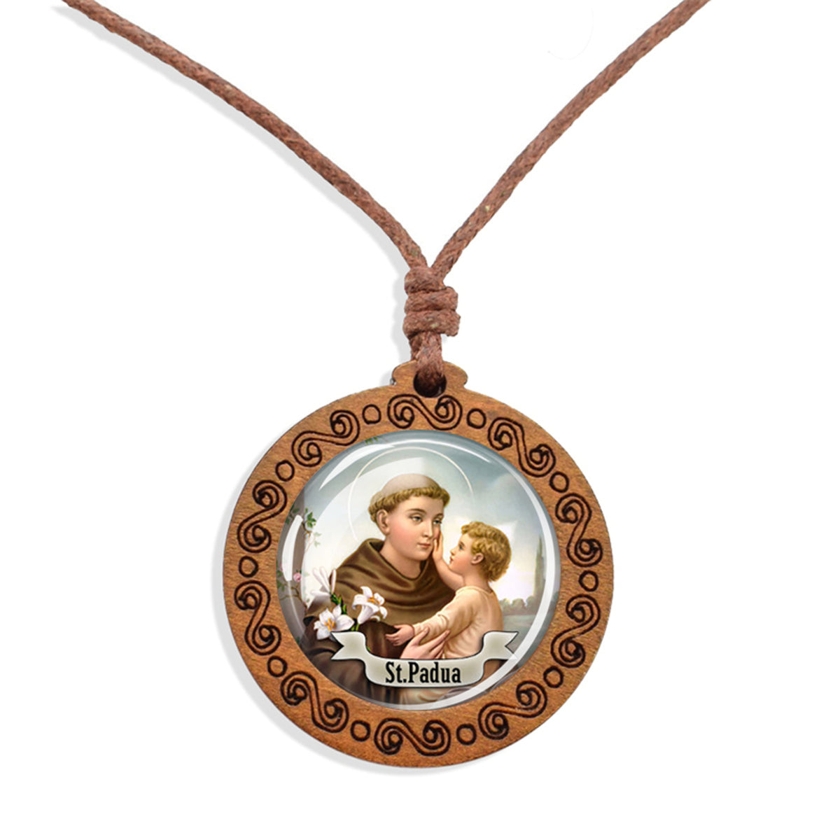 • This unique necklace features a natural wooden frame encasing a vibrant dome image of one of twelve saints, each styled with retro flair and symbolic detail. Representing faith, courage, protection, and wisdom, each saint brings their own energy and message to this wearable expression of spirituality.